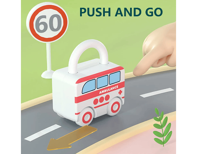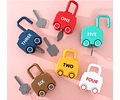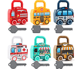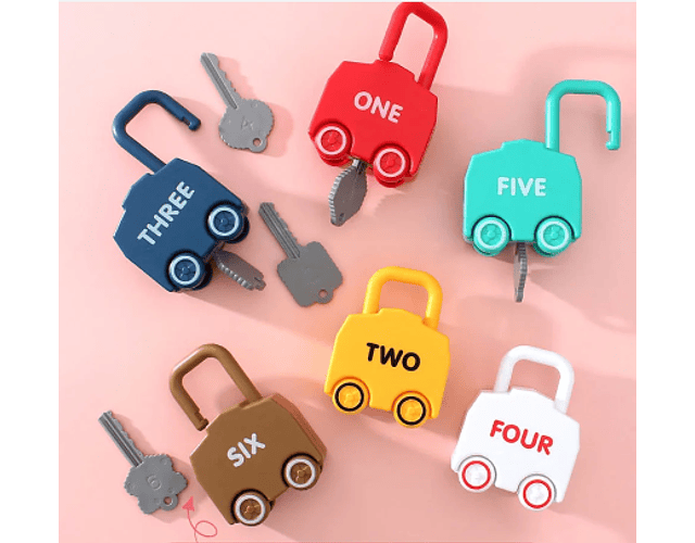Set de 6 candados con forma de vehículos, cada uno con un diseño único (ambulancia, camión de helados y camión de café). Incluye llaves para abrir y cerrar los candados, promoviendo el juego interactivo y el aprendizaje de colores y números. Fabricado con materiales seguros y resistentes, ideal para niños a partir de 3 años.