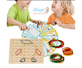 Este juego de geoplano es una herramienta educativa ideal para que los niños desarrollen su pensamiento lógico, coordinación y habilidades motrices mientras se divierten. Incluye una base perforada y tarjetas ilustradas con modelos de animales, insectos y figuras geométricas para reproducir utilizando bandas elásticas de colores.